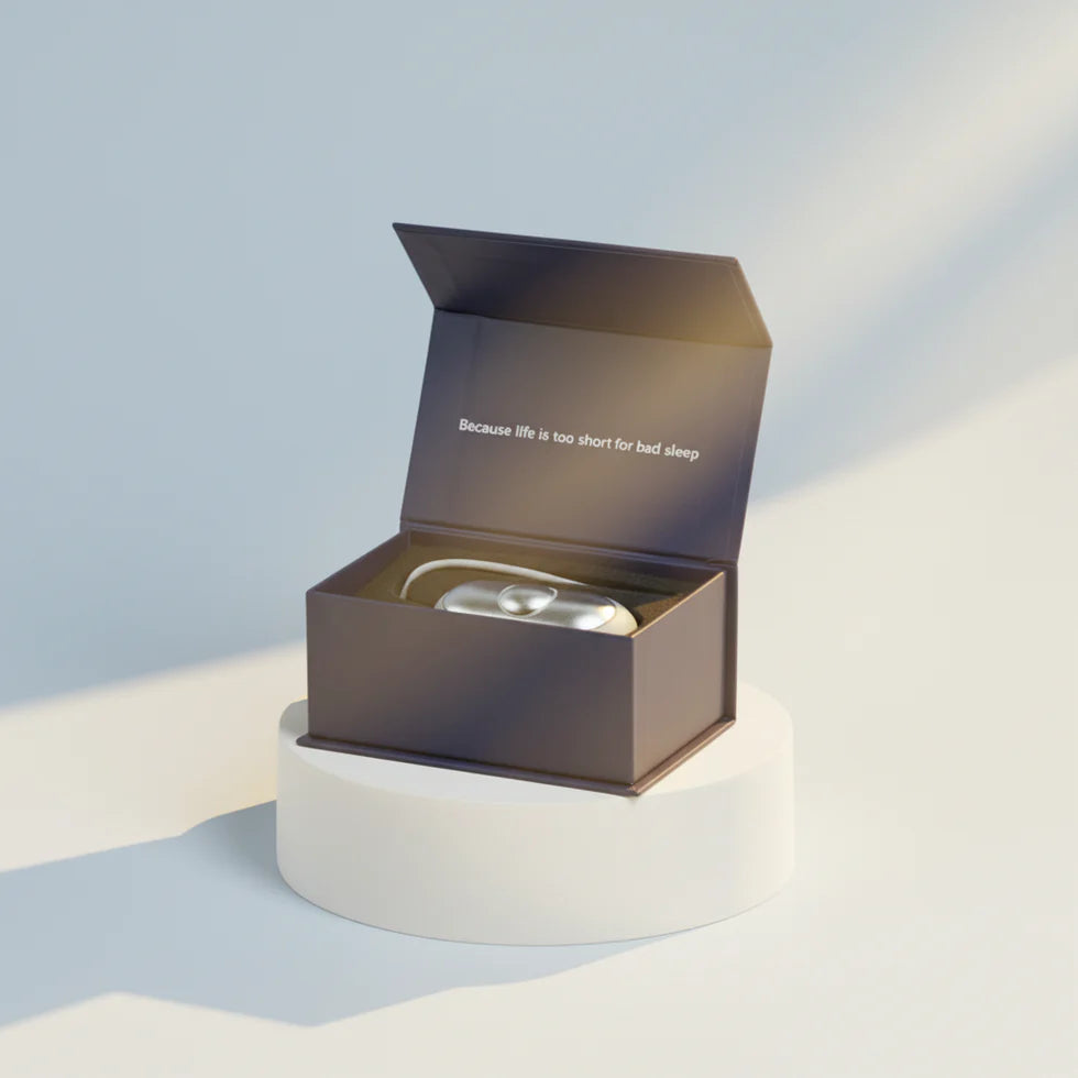 NapPulse skickar mjuka mikropulser genom handflatan som signalerar till ditt nervsystem att varva ner. Håll den i handen 20 minuter innan du lägger dig — ingen medicin, inga appar.